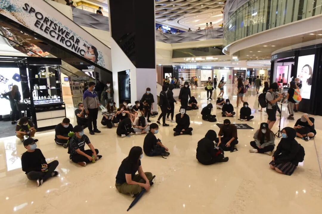 21日晚上,很久没出现在公众视野的黑衣人出动了,他们大约二三十人,在香港元朗的一家商场内聚集静坐。