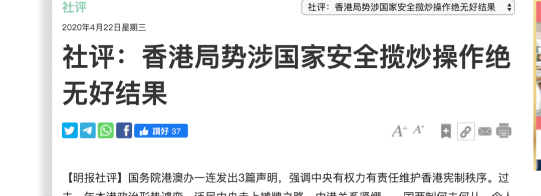 就连在修例风波中更偏向抗议者的《明报》,22日都以“社论”名义发文示警。这篇名为《香港局势涉国家安全揽炒操作绝无好结果》的文章警告香港的一些人,不要“以国家安全作为政治要胁筹码”,不要觉得“国家安全”是中央痛处,“美国牌”“港独牌”都是可以借助的工具,那不仅有可能毁掉“一国两制”,还会令香港走上绝路。