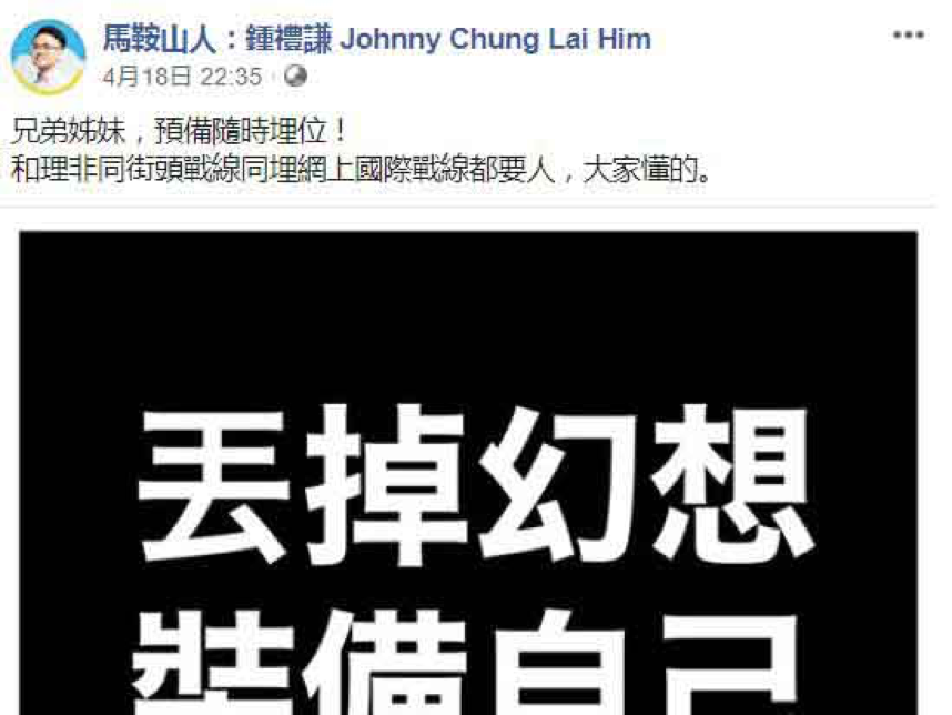 比如沙田区议员钟礼谦日前在脸书上评论一条帖文时说,“兄弟姊妹,预备随时埋位!和理非同街头战线同埋网上国际战线都要人,大家懂的”。荃湾区议员陈剑琴也发文声称要“勇武抗敌,守护吾土”。
