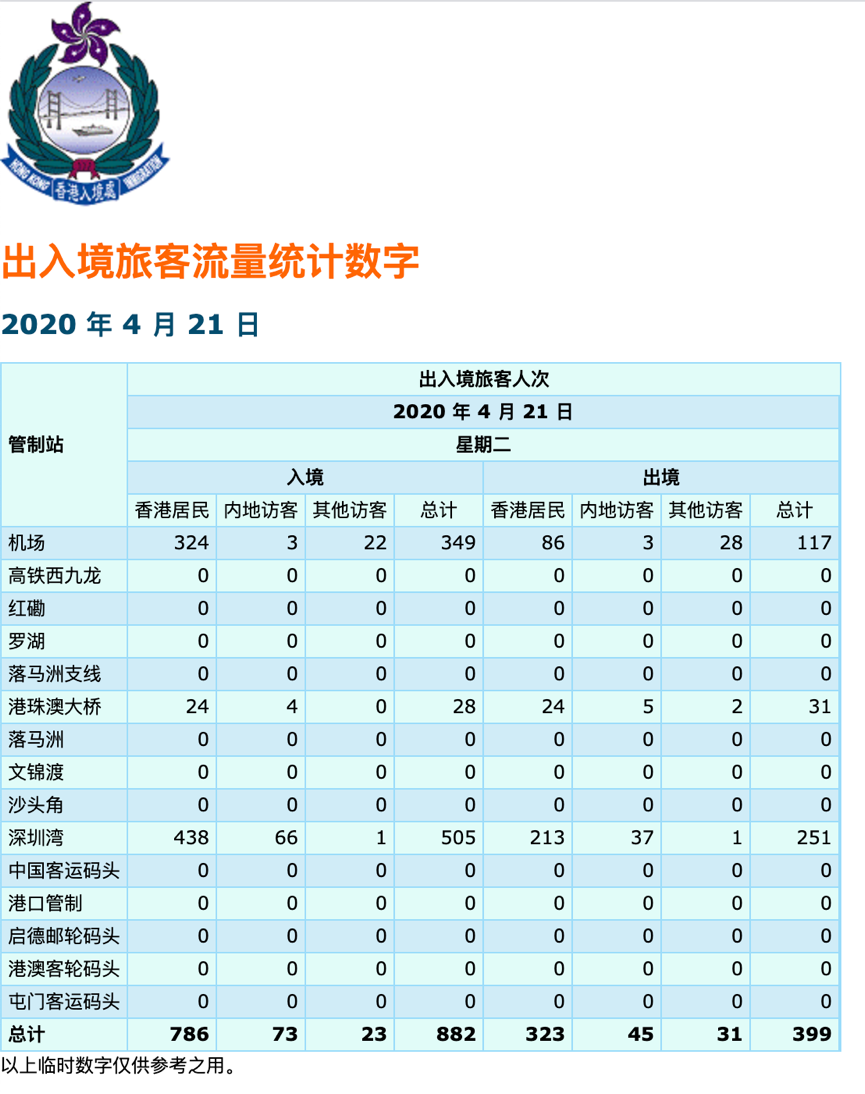 但今年,看看香港入境处的数据,4月21日,这座国际大都会只有882人入境,399人出境,其中绝大部分还是香港居民。这个数字即使放在疫情依然蔓延的背景下,也足以令人唏嘘。