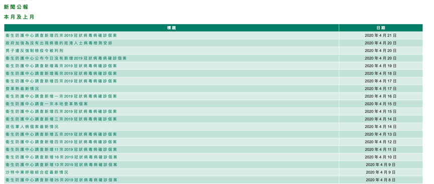 香港特区政府卫生署网站最近十几天对香港新冠肺炎确诊病例新增的通报。(4月8日到21日)