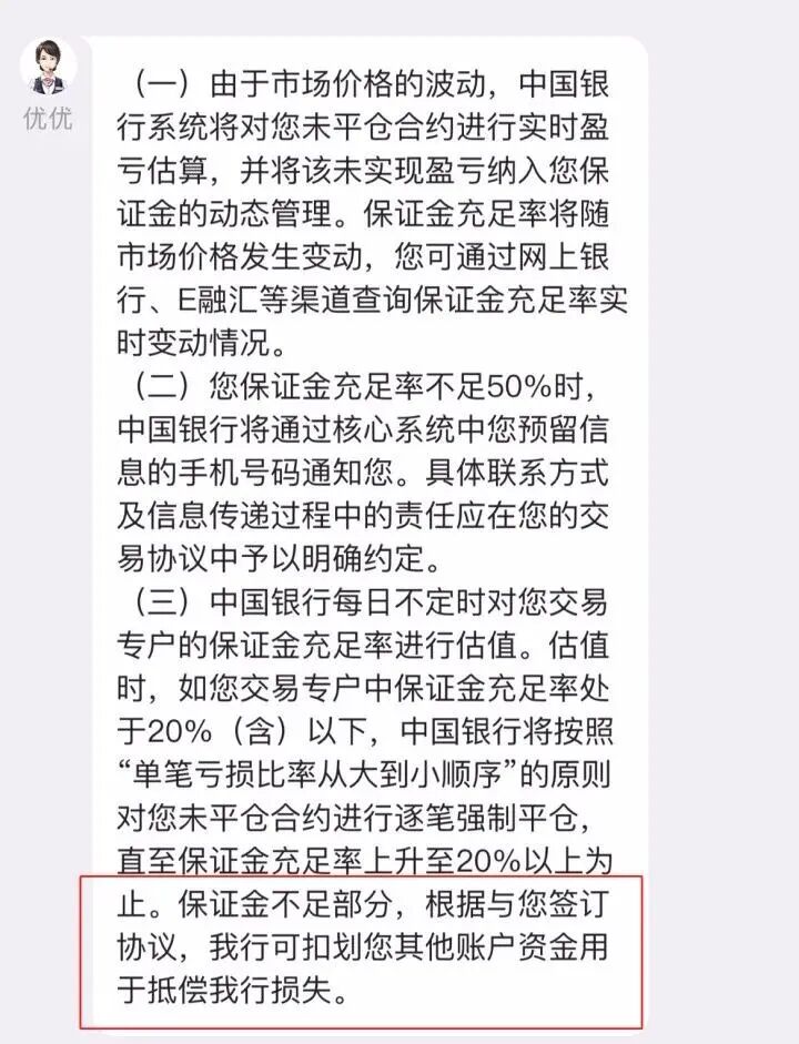 这里所说的“结算价”,是以银行冻结客户时的价格结算还是以WTI原油当天的结算价结算,也令投资者存疑。如果按照第二天凌晨5点北美原油的结算价来计算,早早在当晚22:00冻结客户账户的意义何在。