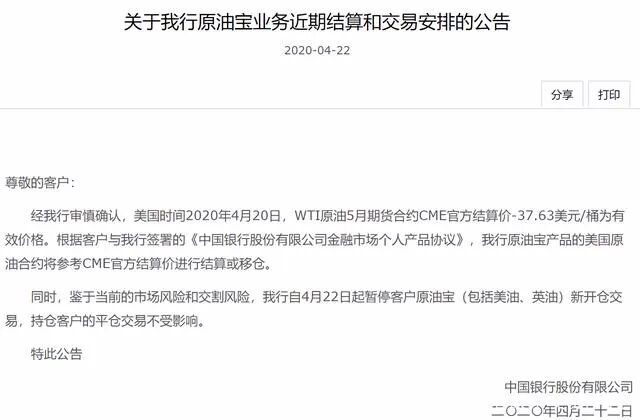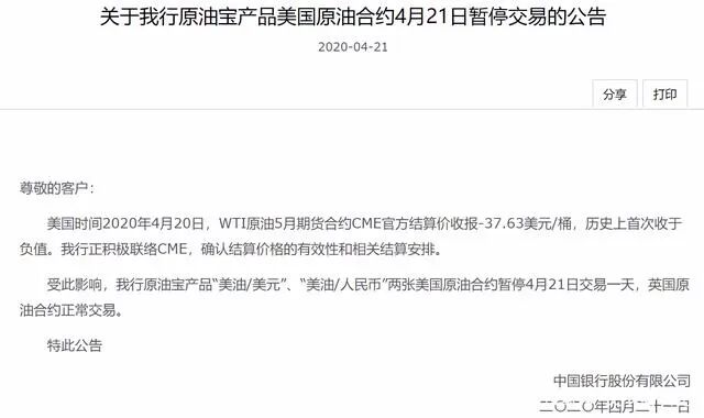 中国银行在21日和22日连发两个公告,4月21日公告暂停美油期货交易一天,4月22日公告则表示要投资人按-37.63的收盘价结算或移仓,这一下就炸锅了!众多投资人纷纷表示不服:“我们可以认亏,但是我们不认宰!”