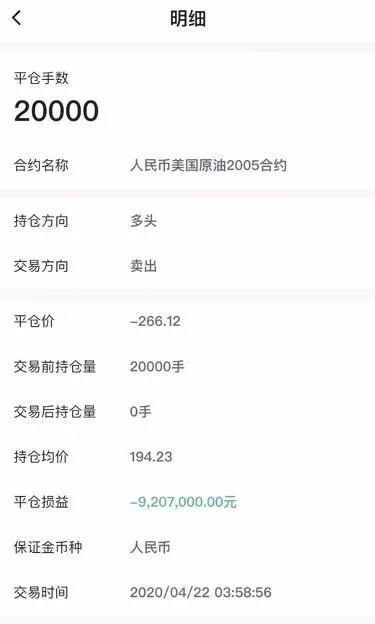 另外就是追责的问题,真不知道中行哪里来的勇气,把投资人的本钱亏光了,还理直气壮要投资人还钱。下面这位原油宝投资人花了500多万买了20000手WTI原油2005期货,结果不但本金亏光,还倒欠银行920多万的债!类似于这样的投资人成千上万,许多人都是亏光了一辈子的积蓄,还要欠一屁股债。