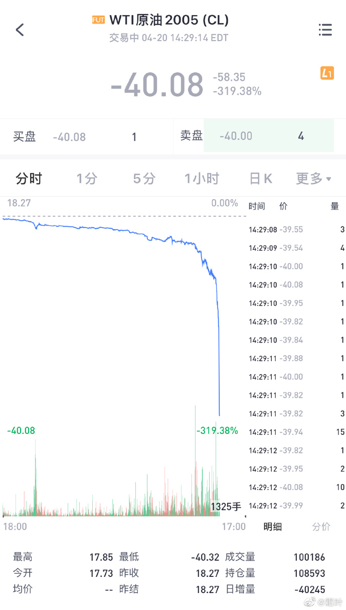 那么,这样一来就会为金融机构围猎投资人埋下伏笔。许多人一看到WTI原油2005跌到了-40美元一桶,就蹦起来了,高潮了,要是我买了就好了,不但白赚了一桶原油,原油生产商还得倒贴40美元一桶给我,净想美事儿了!