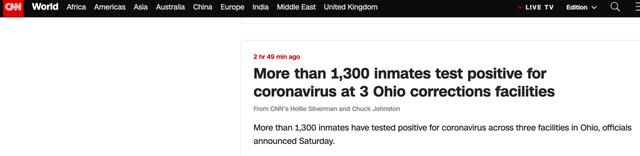 4月18日,多家美媒报道,俄亥俄州的两所监狱和一所在押人员医疗中心出现聚集性感染,共计1300多名在押囚犯新冠病毒检测呈阳性,其中4人死亡。