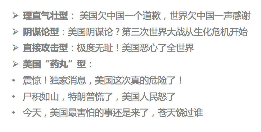 “西方国家吓傻了”“这些国家的女人都想嫁到中国”“拯救世界靠中国”这种套路的文章,阅读量和转发量都很高,不少自媒体号靠写“爱国”雄文而粉丝大涨。