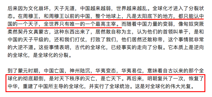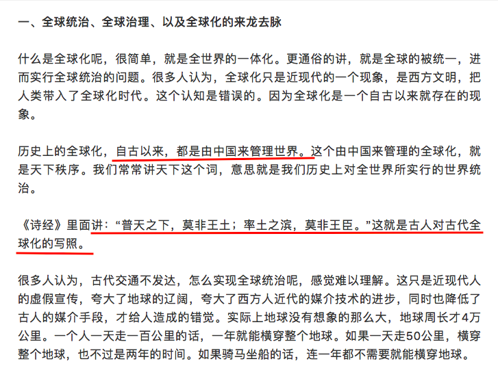 有一位自媒体作者重新定义了“全球化”的概念,所谓全球化,就是由中国来统一全球,自古以来就是这个样子,因为古籍有云:“普天之下莫非王土”!