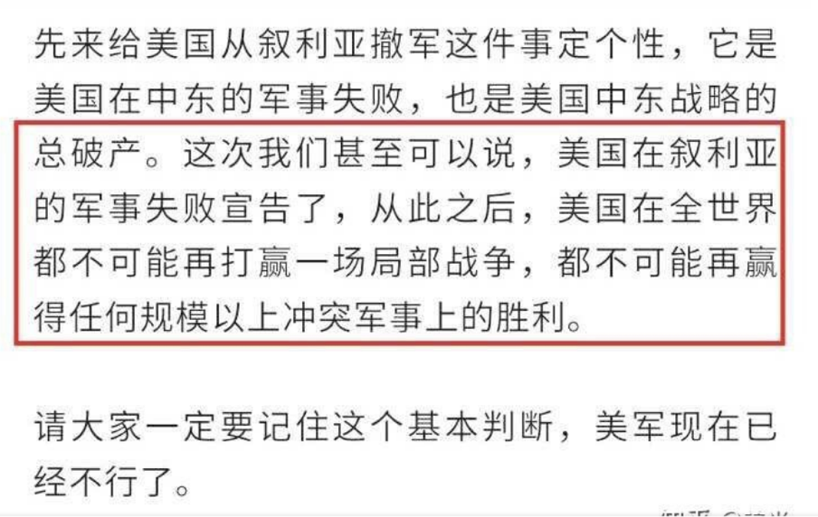在他的设想里,美国已经不行了,不可能再打赢任何一场局部战争,也承受不了任何规模的军事冲突: