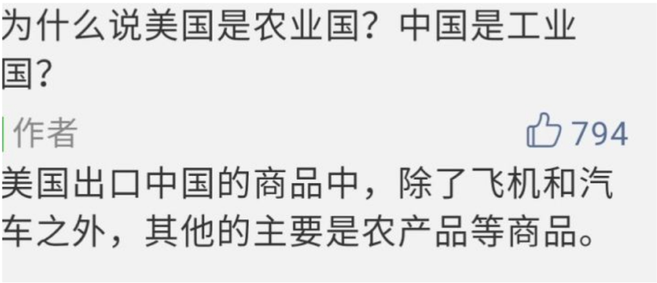 在他眼里,美国是个地道的农业国,证据是:美国除了出口飞机和汽车,全靠农产品撑场子了: