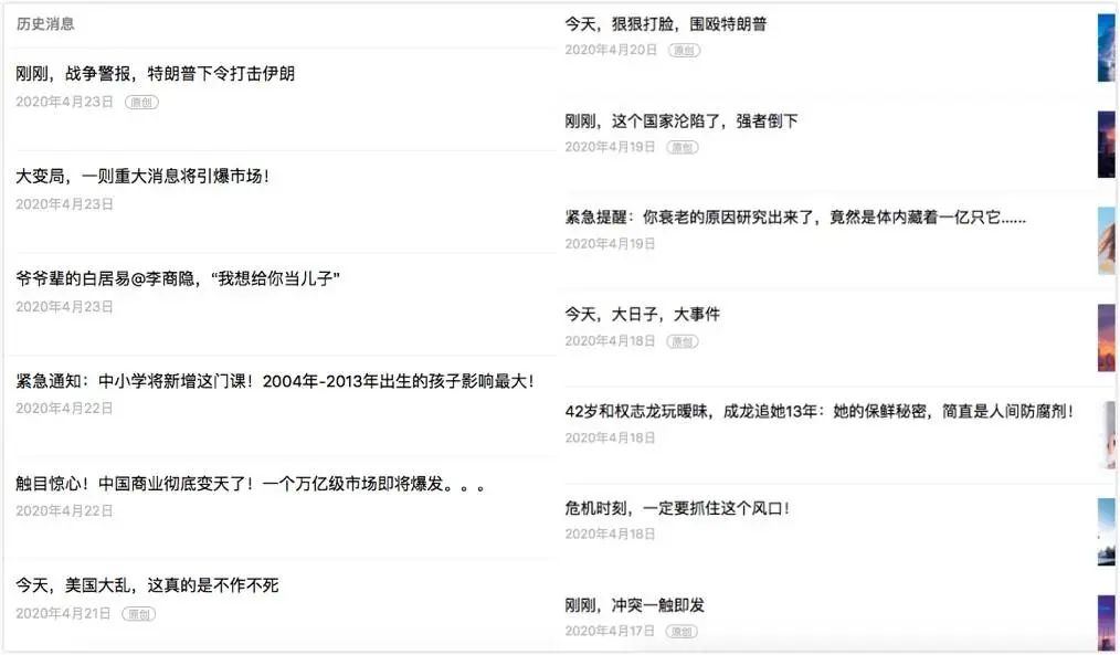 几乎所有的文章关键词都是这些:史无前例、惊天大变局、末日大崩盘、血流成河、丧心病狂、全球沦陷,石破天惊,大战来临,日本哭了,美国危险了,等等……