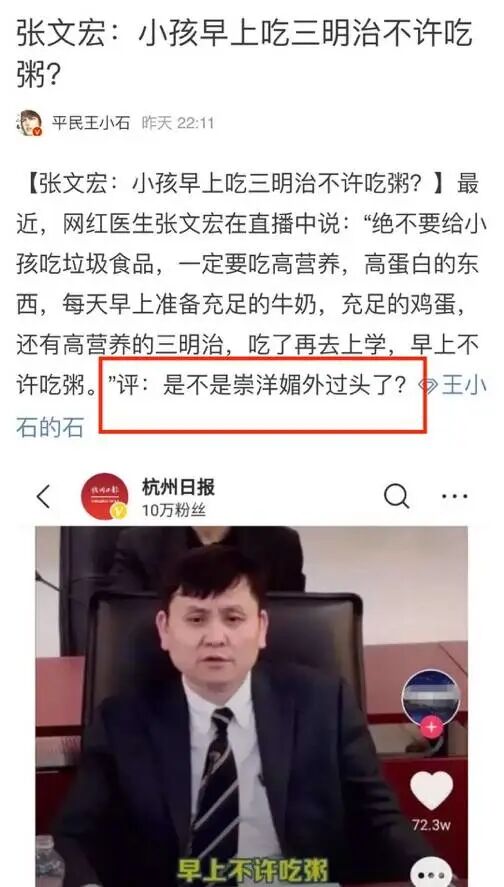 张文宏的本意,就是在养生角度提出了一个医生的专业见解,却直接被泼上了中西对抗、崇洋媚外的脏水。仿佛和西方沾上边儿的一切东西,都是腌臜腐朽的舶来品。