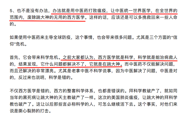 在这个作者笔下,中国不仅在古代就维持着世界秩序,在如今,也只有中国能拯救美国,毕竟,缓解美国疫情得靠中医,因为“西医不是科学”:
