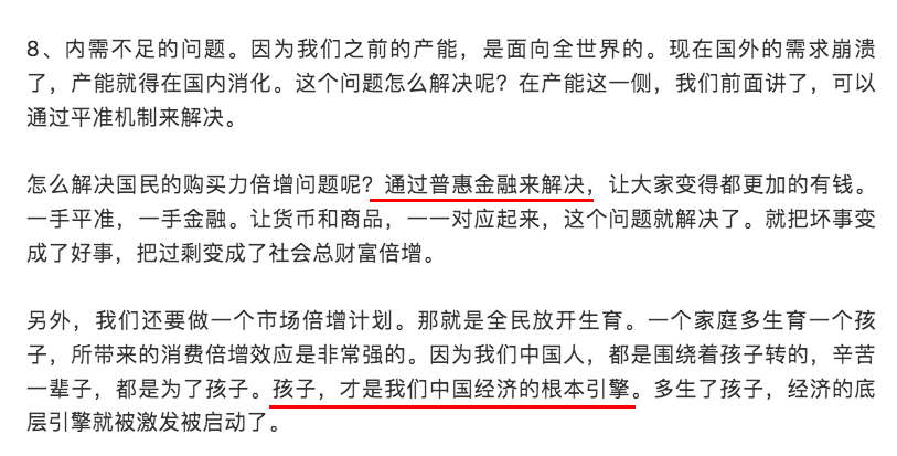 按照这位作者的想法,要搞好中国的经济,核心战略就是:国家负责给大家发钱,我们负责多生孩子。