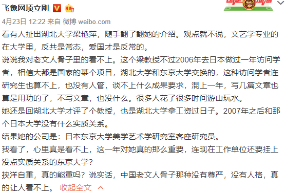 就在这几天,我们有幸看到了几位“文化圈”的中老年人士,有支持废青的,有精日的,有恨国的。除了立场之外,关键是水平也很一般,基本上就是比较婉转的喷和立场输出。不少网友看了之后,可能觉得“这博导、教授我也当得”。(具体言论不搬运了,可去微博搜索“梁艳萍”)