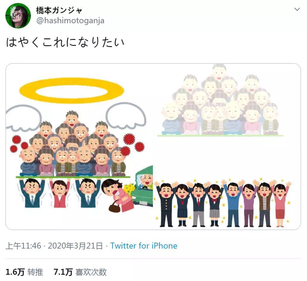 在社交媒体上,一个日本网友上传了一幅漫画:病毒“带走”了老年人,年轻人减轻了负担,欢欣鼓舞。