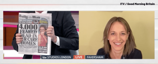 在英国,电视台主持人在提问卫生部次长海伦·沃特利是否有大量老人死在养老院时。