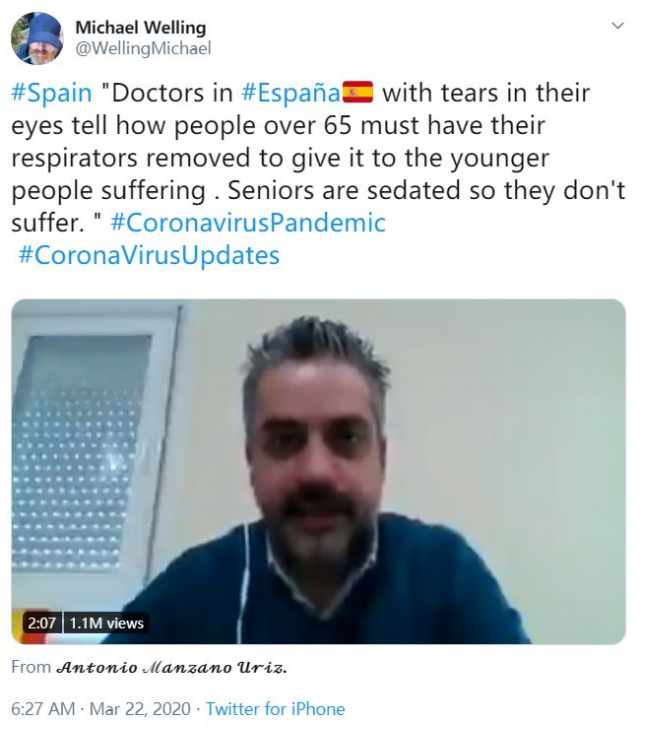 有西班牙的医生在社交媒体上说了马德里医院中的情况:65岁的老年人被迫摘下呼吸机,因为这些呼吸机要拿去给更年轻的人。