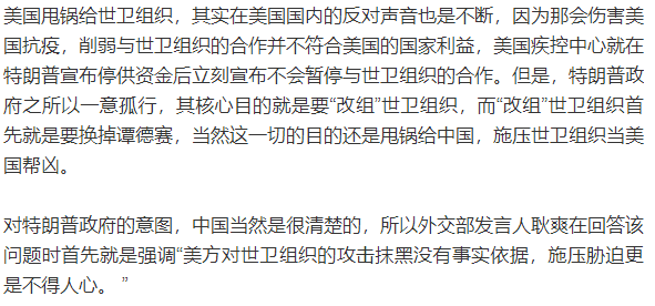 就像占豪(微信公众号:占豪)之前分析的那样,特朗普政府搞世卫组织、搞谭德赛,核心原因就是世卫组织和谭德赛没有听从美国,没有按美国的旨意去参与抹黑中国,世卫组织的实事求是客观反映中国疫情,更是让美国抹黑中国缺少权威依据,变成了美国政府和美国政客的独角戏。哪怕西方盟友时而有一些零星表态,但客观上也并未全力支持美国。