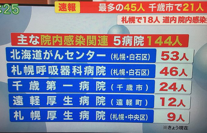 北海道的5家医院更是成为这次疫情的风暴中心,医患交叉感染的事例时有发生,目前5家医院已经有144人确诊,占北海道总确诊人数的1/4。