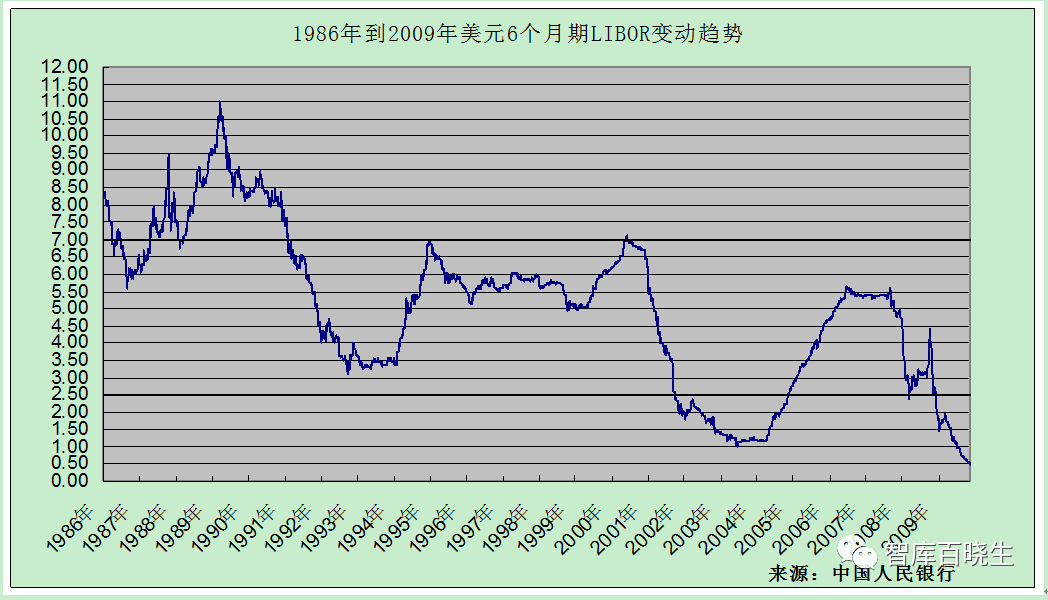 1986年开始美元6个月LIBOR持续上升触及历史最高点11%,而后掉头向下,1994年跌到3.0%左右。