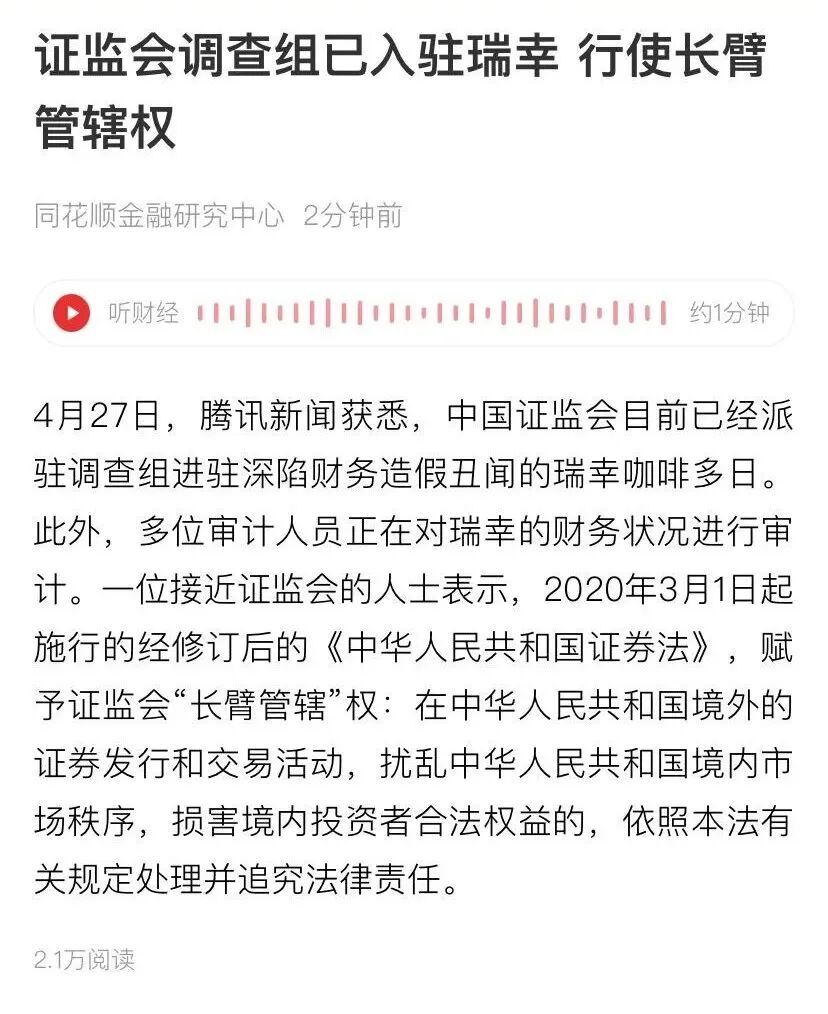 据路透社报道,2020年1月,理想汽车已申请在美国IPO,计划筹资至少5亿美元,最早于2020上半年上市。如果理想汽车IPO因此泡汤,这真算得上千古冤案,一杯咖啡引发的惨剧。4月27日最新的消息是,因为财务造假,中国证监会目前已经派驻调查组进驻瑞幸咖啡多日,多位审计人员正在对瑞幸的财务状况进行审计。此外,由国务院副总理刘鹤主持的金融稳定发展委员会第二十六次会议,明确表示了对上市公司造假、欺诈等行为,要从重处理。可以预见,等待瑞幸咖啡的将会是一场毁灭级的监管风暴,其背后的始作俑者陆正耀等人也将得到应有的制裁。证监会这一次不仅要杀鸡儆猴,给所有国内上市公司以及海外中概股看,也要给美国SEC以及PCAOB看:中国对于财务造假依然是零容忍。当然,如果没有瑞幸咖啡,是不是SEC和华尔街就要向中国企业伸出双手拥抱了?也不见得,瑞幸咖啡只是加速了这个进程。