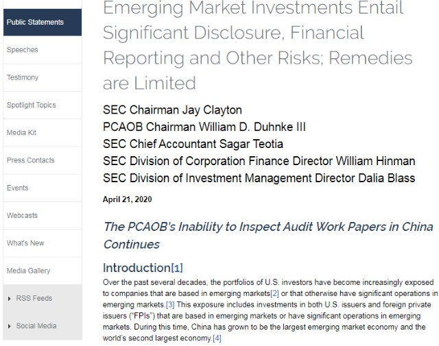 史无前例,美国的证监会主席首次向投资人公开喊话:不要投资中概股。4月23日,美国证券交易委员会(SEC)主席杰伊·克莱顿(Jay Clayton)接受采访时表示,因为信息披露的问题,他提醒投资者近期在调整仓位时,不要将资金投入在美国上市的中国公司股票。就在一天前,克莱顿联同美国公众公司会计监督委员会(PCAOB)主席William Duhnke等五位官员共同发布声明,提醒美国境内投资者在投资总部位于包括中国的新兴市场,或在新兴市场有重大业务的公司时,注意财务报告及信息披露质量的风险。这场由瑞幸造假引起的风波,到底有什么影响,中概股会集体回国吗?这件事背后有两个隐藏的信息。