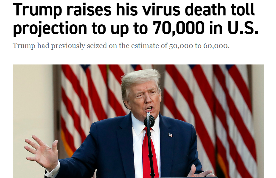 最新消息是,特朗普把美国死亡人数从5到6万人,提到了7万人。