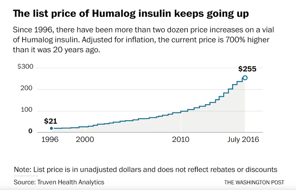 华盛顿邮报曾报道,医药巨头礼来公司一款胰岛素的价格,1996年时是21美元,到2016年后已经高达255美元,涨幅实在惊人。
