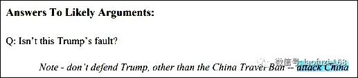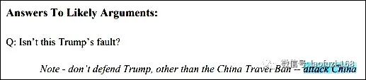 备忘录提供了三大攻击路线:一是批评中国掩盖疫情等;二是指责民主党对手对华立场软弱;三是强调自己会找中国讨说法等。口号是“不要为特朗普辩护,攻击中国就行”。