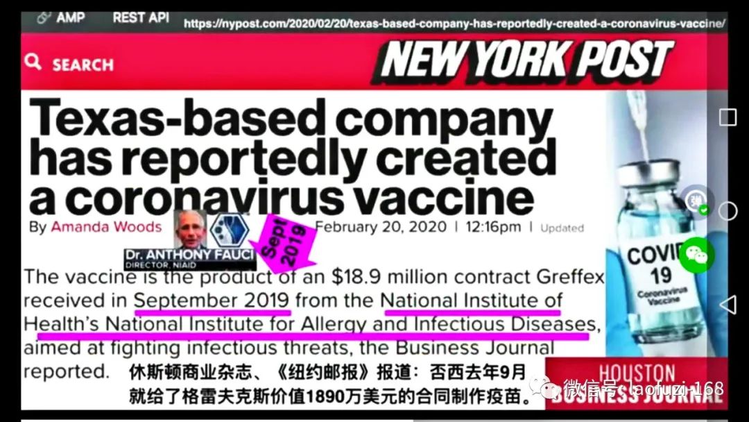 据休斯敦商业杂志、《纽约邮报》报道,“否西去年9月就给了格雷福克斯价值1890万美元的合同制作疫苗”。要知道,“疫苗需经多年测试才能临床应用,特朗普黑帮肯定早已制作疫苗然后策划这场流行病以摧毁中国、所有美国的假想敌人、所有的老弱病残人口”……“掩盖的真相终将大白于天下”。