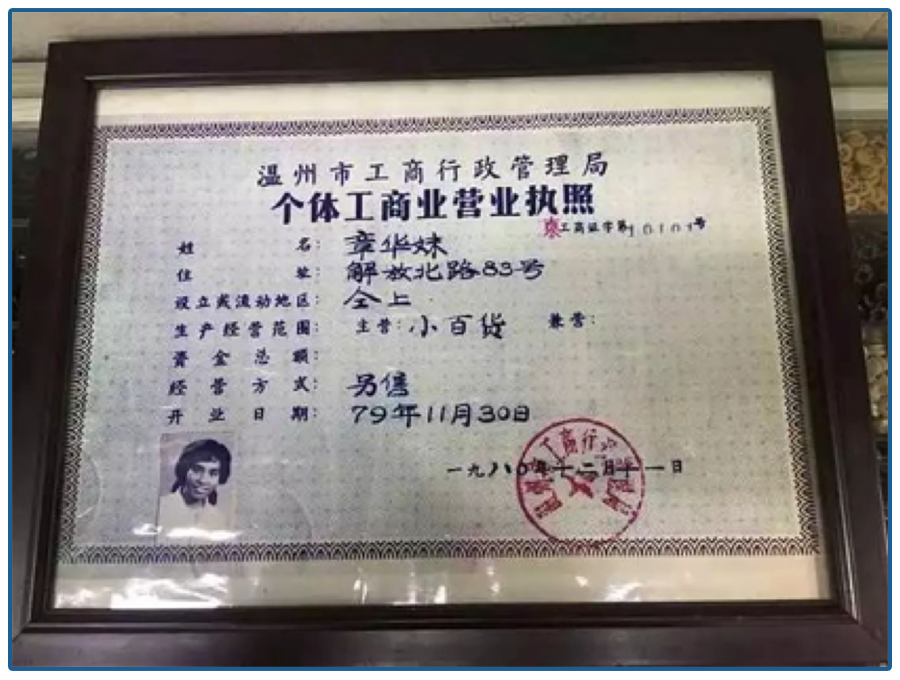 改革开放后,温州是反应最快的,全国第一份个体工商业营业执照诞生于温州: