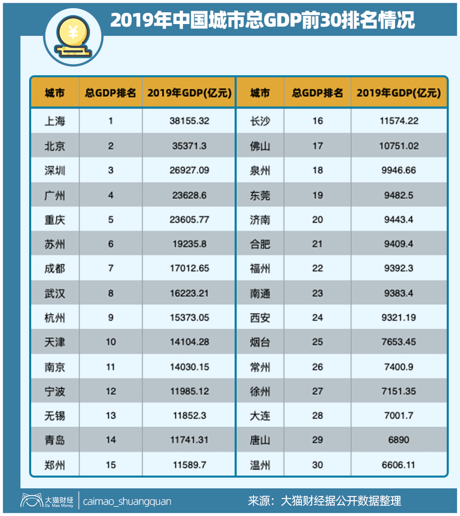 2019年全国GDP总量为99万亿,排名前30强的城市占了43%,比例非常高,这意味着财富集中度增加了,而排名变化也展现了不同地方的竞争现状。