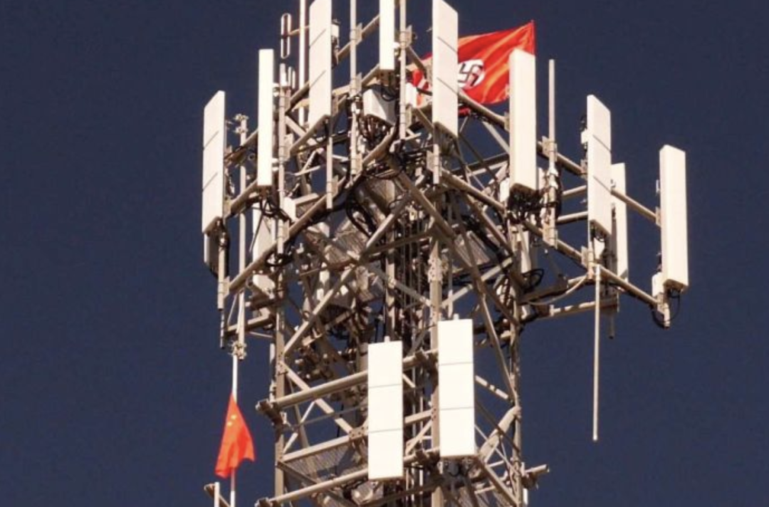 ▲在政客和媒体的带领下,西方民众将中国国旗和纳粹旗一起挂到了中国公司的网络信号塔上。