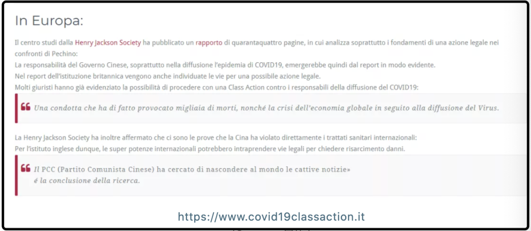 4月21日,在美国舆论势力的鼓动下,意大利境内成立了“向中国政府集体诉讼索赔”的联署网站。意大利通讯社Adnkronos报道称,意大利消费者协会Codacons也正试图“问责中国”。