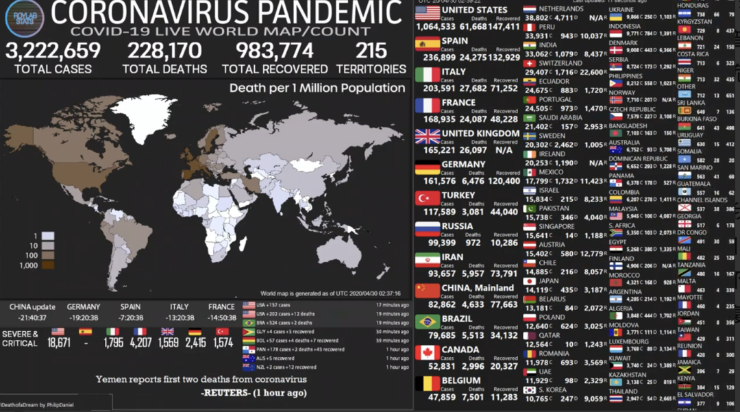 ▲根据世卫组织公布的数据,美国确诊超100万,意大利确诊超20万,欧美累计死亡约20万。