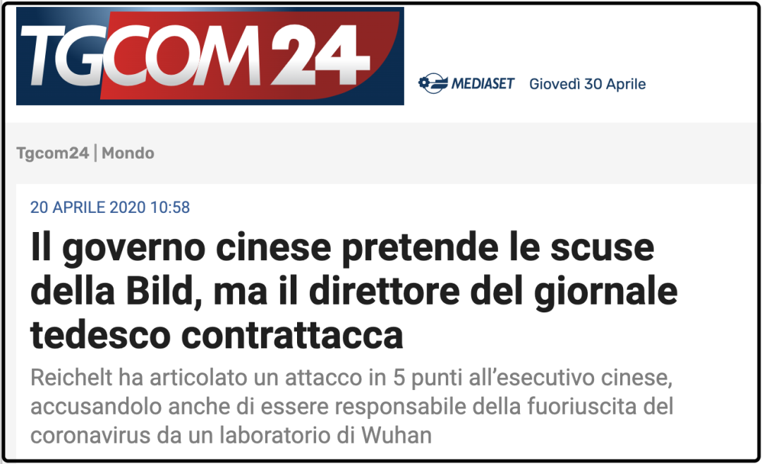▲意大利TGCOM24新闻网发布支持德国《图片报》声讨中国的文章,引发意大利舆论热议。