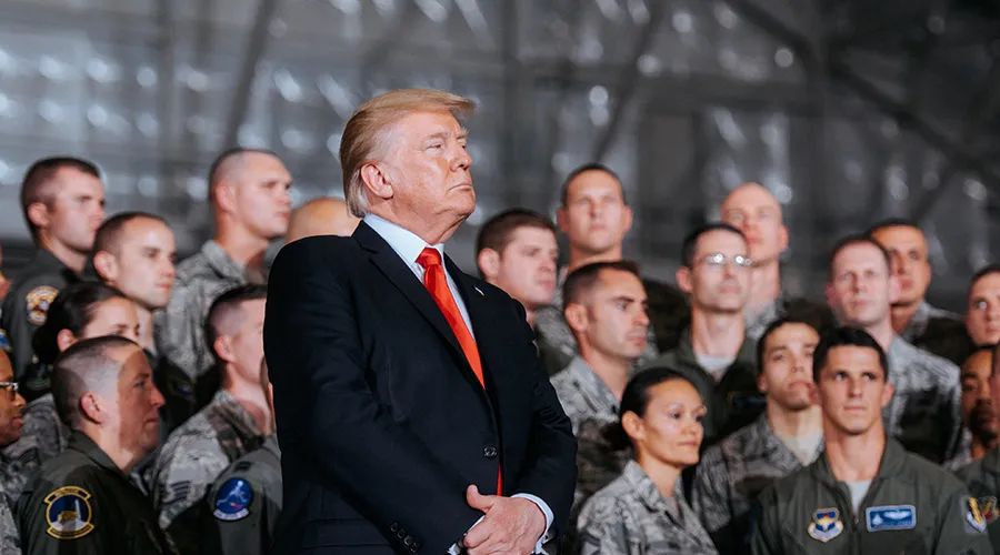 (美国总统特朗普和军人在一起)