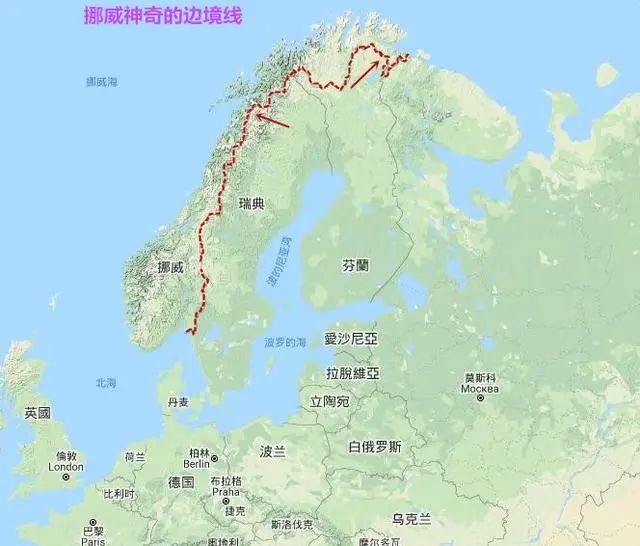 挪威的地形非常独特,斯堪的纳维亚山脉以西全是它的领土,让其拥有一条狭长的海岸线,直接阻断瑞典和芬兰通往大洋的通道,和俄罗斯接壤。