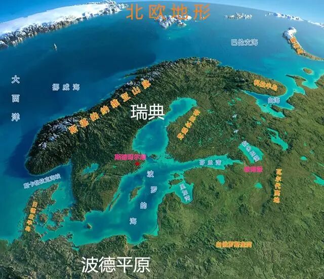 看下北欧地形,只有一个巨大的纳维亚半岛。斯堪的纳维亚山脉纵贯纳维亚半岛南北,以东是瑞典,以西是挪威,地形非常简单。