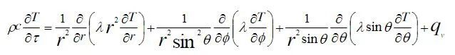 地幔温度下降后,地核的热量就会加速向外传递,计算地球重新稳定后的温度分布,要用到《数理方法》,这门课是大学物理的四大天书之一,瞧瞧球坐标下的导热微分方程: