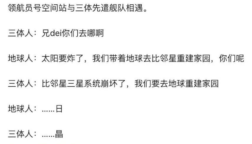比邻星所在的半人马座三星就是小说《三体》里三体人的家乡,有三颗太阳,所以就有了下面这个段子……