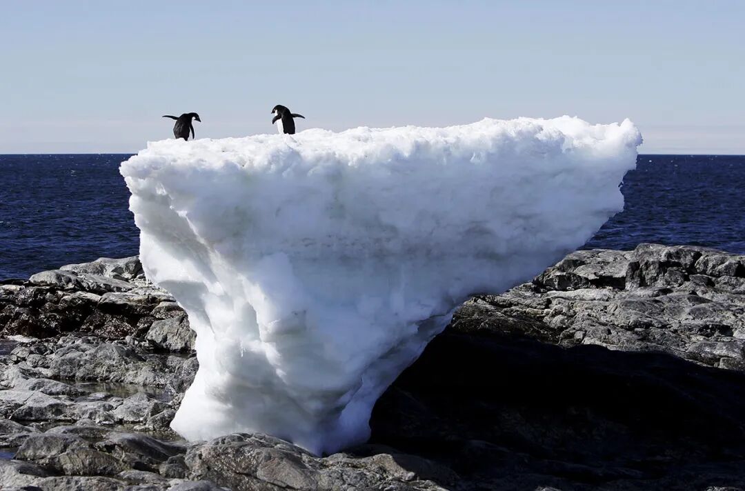 图为两只阿德利企鹅站在一块正在融化的冰上。