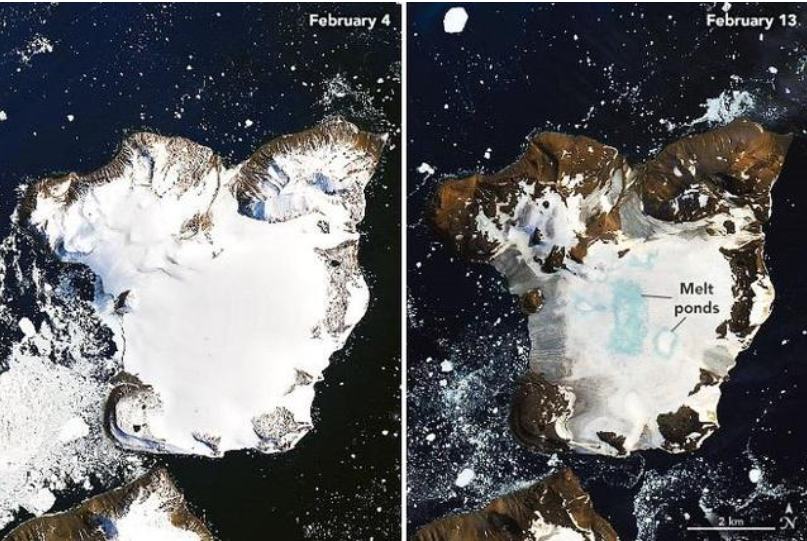 NASA的地球观测卫星日前发布了2张南极图片,其中一张拍摄于2月4日的鹰岛,另一张摄于2月13日,这两张照片可以看出高温对当地冰盖和冰川的影响。
