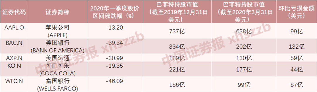 一季报显示,截至2020年一季度,伯尔希尔·哈撒韦公司的证券投资69%都集中在五家公司上,苹果、美国银行、可口可乐、美国运通、富国银行。