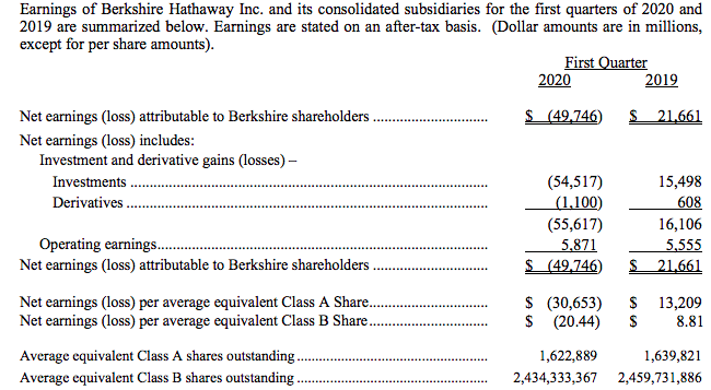 北京时间5月2日晚间,巴菲特旗下的伯克希尔·哈撒韦公布了2020年一季报:期内,归属于股东的净亏损为497.46亿美元,上年同期盈利216.61亿美元。