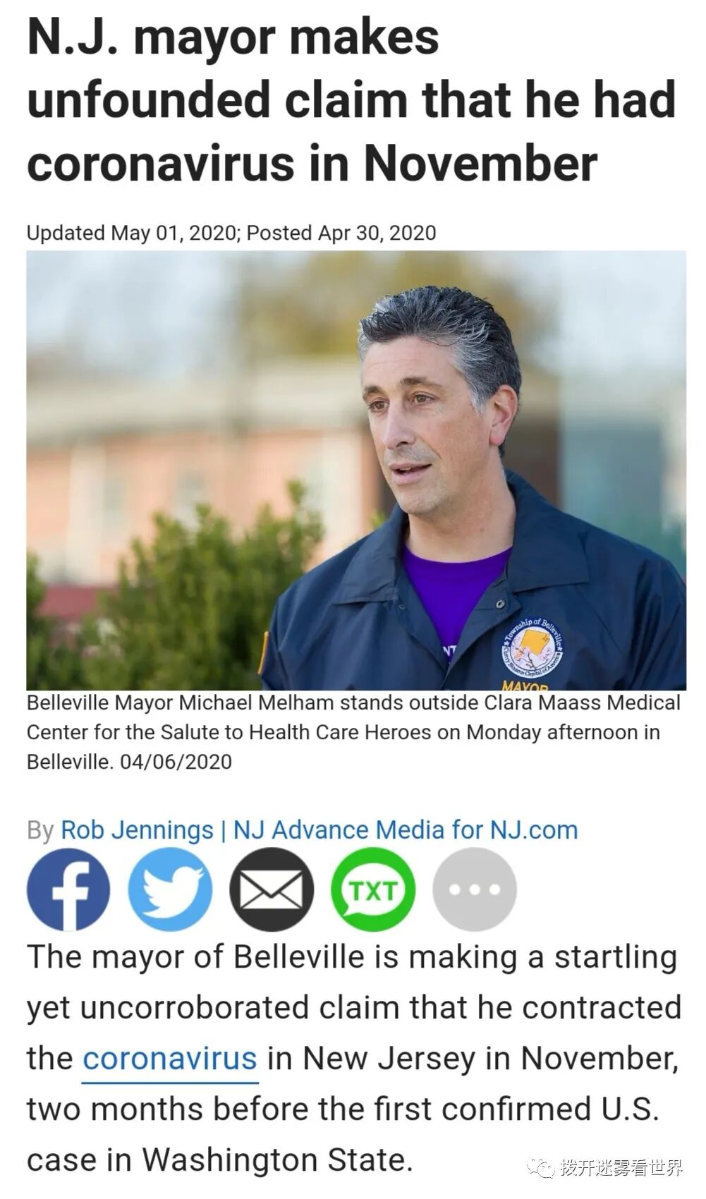 美国新泽西州贝尔维尔市长迈克尔·梅勒姆(Michael Melham)4月30日表示,自己在2019年11月就已感染新冠病毒。检测结果也显示,他已拥有新冠病毒抗体。