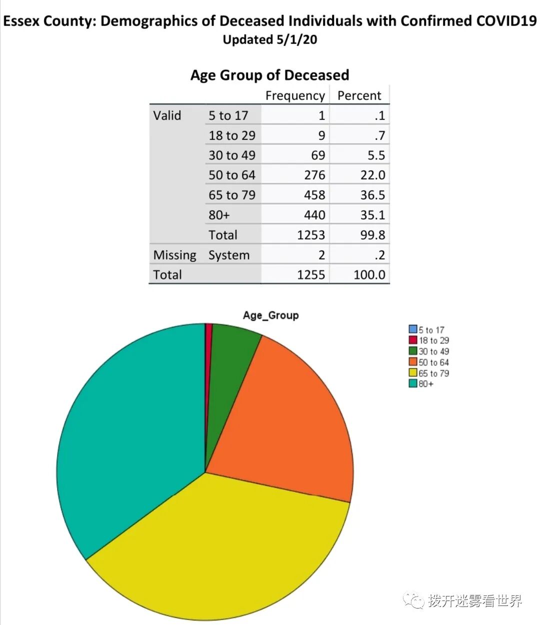 在Essex县死亡的一千多人中,18岁以下的只有1人,30岁以下的只有10人。50岁以上的占了93.6%,65岁以上的占71.6%。