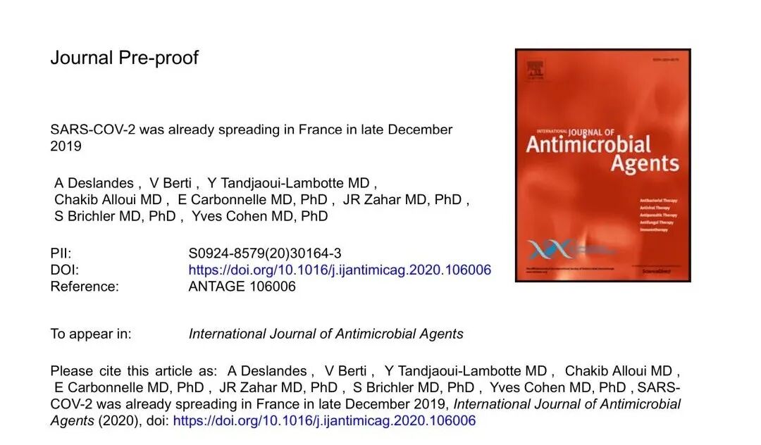 二、最新研究显示:新冠病毒去年12月底已在法国传播据人民网转引医学期刊《国际抗菌剂杂志》网站显示,法国巴黎东北郊塞纳-圣但尼医院集团主持撰写的短篇通讯论文已于5月3日上线发表,其标题为《新冠病毒2019年12月底已在法国传播》。文章作者之一的重症监护室医生科昂(Yves Cohen),当地时间5月3日晚在法国商业调频电视台(BFMTV)的直播节目中披露了研究结论,引发舆论关注。△图为论文首页