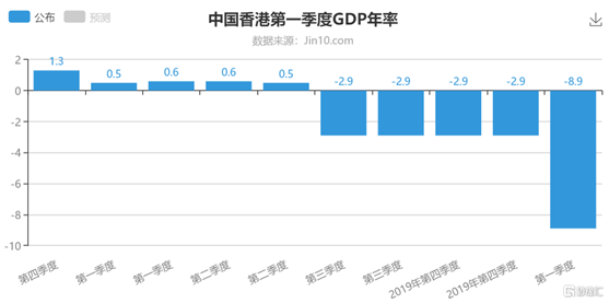 港府公布的数据显示,香港2020年第一季GDP较上年同期实质下跌8.9%,较2019年第四季3%的跌幅进一步扩大,也是自1974年有纪录以来的最大跌幅。